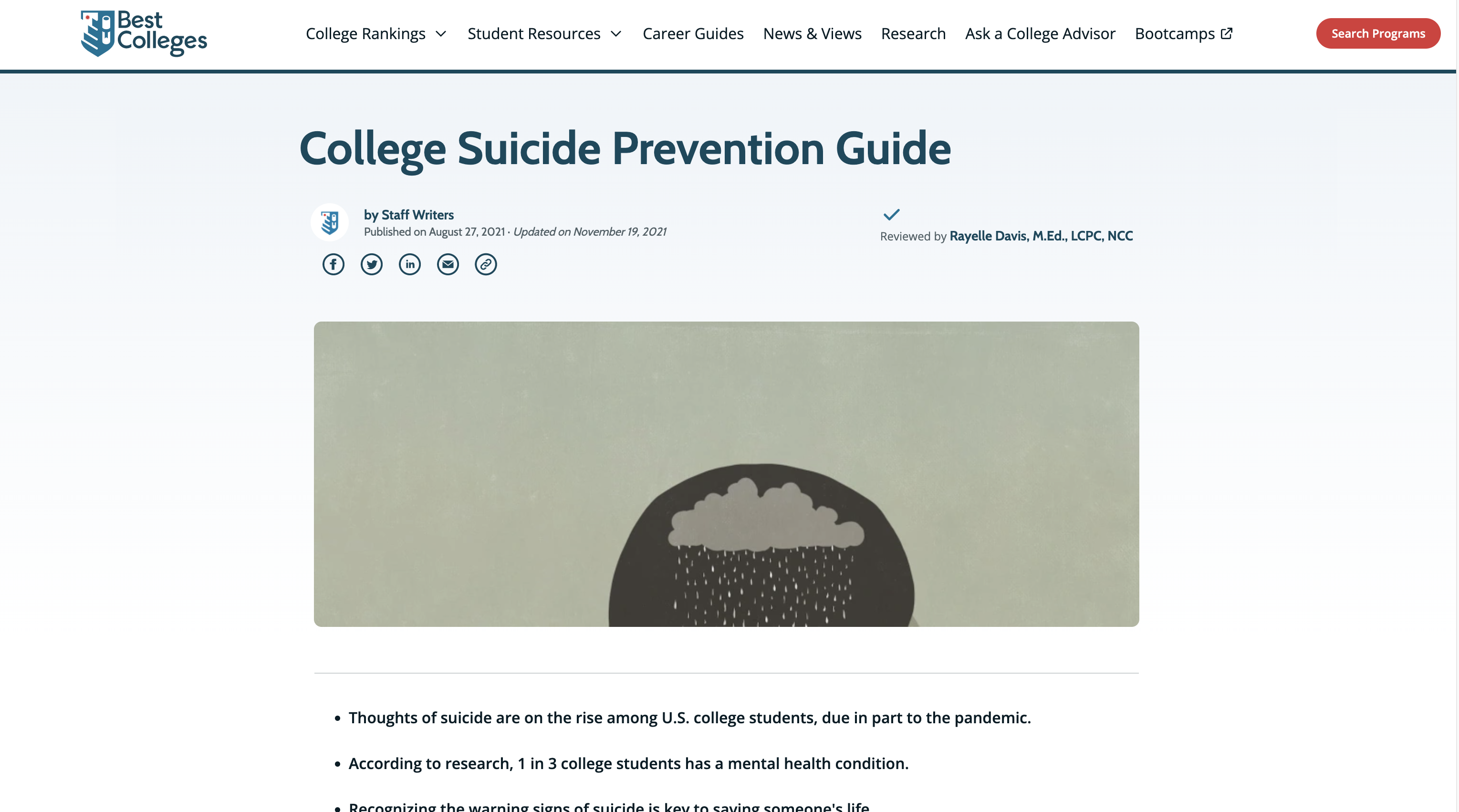 The risk of suicide among college students continues to rise. According to a 2019 study conducted by the American College Health Association, 2 in 3 undergraduates felt overwhelming anxiety in the past 12 months, and 14% seriously considered suicide.